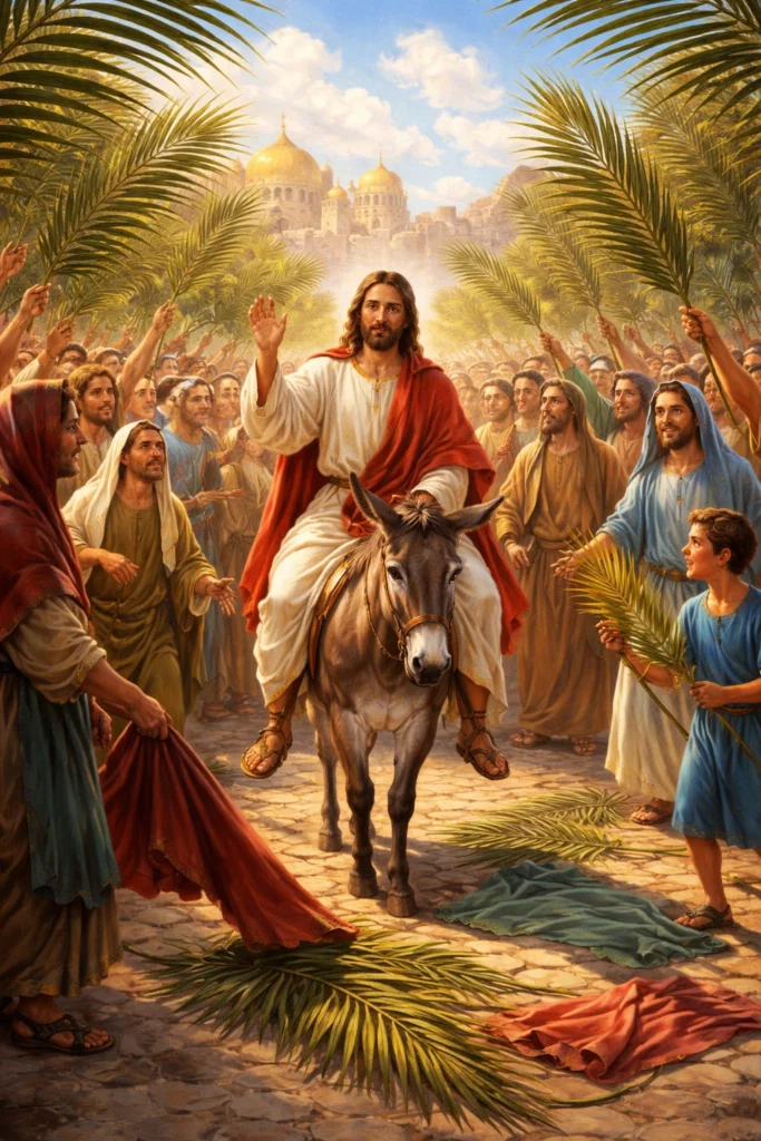 Jesus enters Jerusalem not as a warrior on a horse, but as a humble king riding a donkey. The people welcome Him with palm branches, laying them on the ground before Him, shouting with joy and expectation.